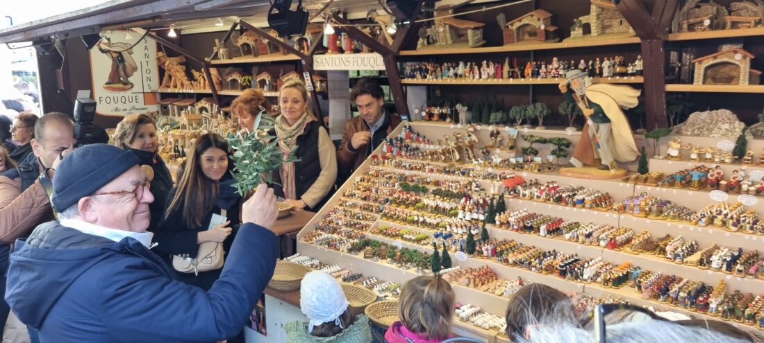 De kinderen staan met gekruiste armen voor de priester en ontvangen een persoonlijke zegen. Hun gezichten stralen van blijdschap. Ik spreek een oudere dame, haar kleinkinderen zijn als santon verkleed. ,,Ik ben zo blij, dit soort missen dragen bij aan concrete geloofsoverdracht. Het verhaal van Kerst moet niet alleen worden verteld worden, maar vooral beleefd.” Buiten klinken weer de tamboerijnen en galoubets. In een vrolijke optocht lopen de santons door de oude straten van Aix richting de markt. De priester in z’n witte gewaad met paarse stola sluit de rij, met een olijftak in de hand. Hij zegent de santonkramen en de verkopers. Mooi, hoe het werk van de santonniers zo de zegen van God draagt en meegaat met de mensen die de figuurtjes kopen.